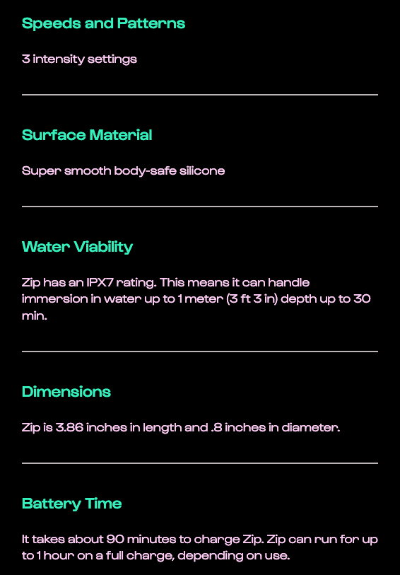 Our bestselling Zip vibe is now a multi-speed and rechargeable bullet vibrator! Zip features a tip for perfectly targeted external stimulation. It is as portable as it is powerful; utilizing a tungsten steel motor with a heavy-duty rotating mass, thus providing a more intense sensation for all three speeds.