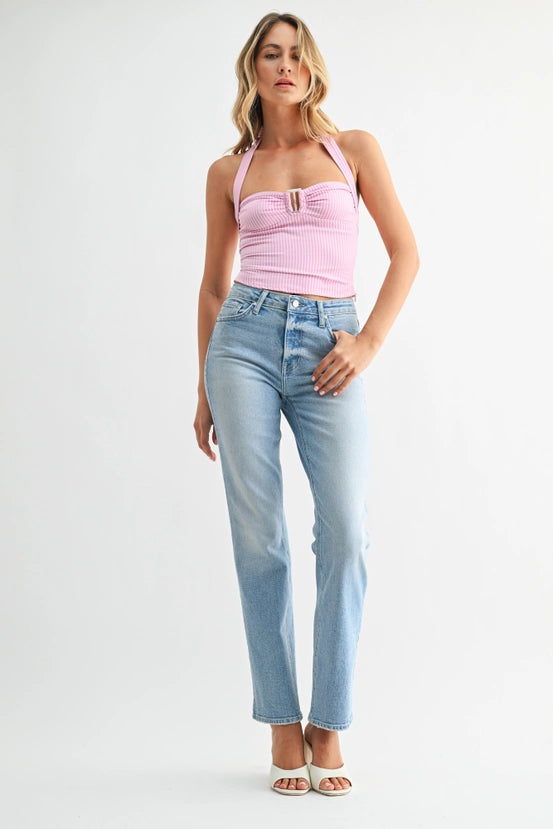 Designed to sit comfortably at the natural waist, this jean offers a flattering, secure feel without pinching or gaping. The stovepipe silhouette falls straight from hip to hem with a clean, streamlined line that elongates the leg while maintaining a relaxed, effortless vibe.