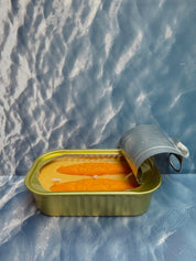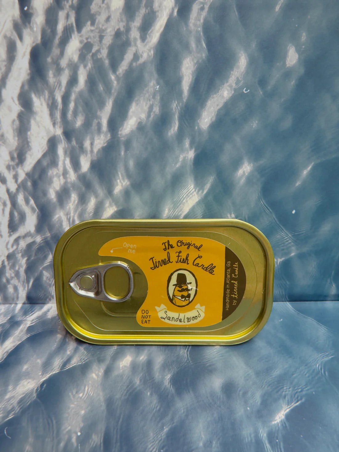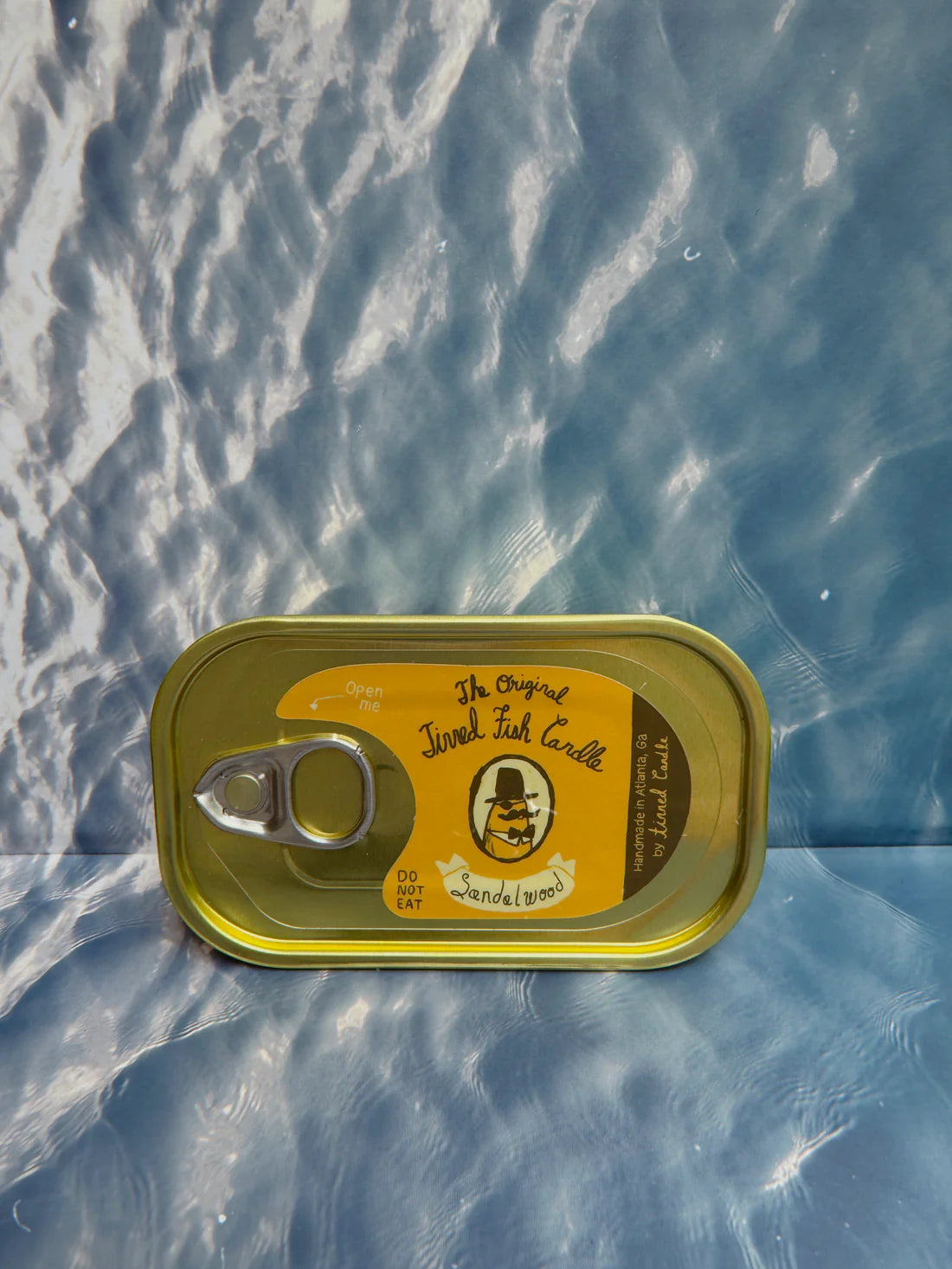 Warm, woodsy, and totally unexpected. This sandalwood-scented candle brings cozy vibes with a bold orange palette inside the tin. The fish? Still in formation. The lid? Still peels just like the real deal. Each tin is illustrated with a playful story and ships in our new easy-open packaging. Soy Wax Blend. Hand poured, sealed, and packaged.