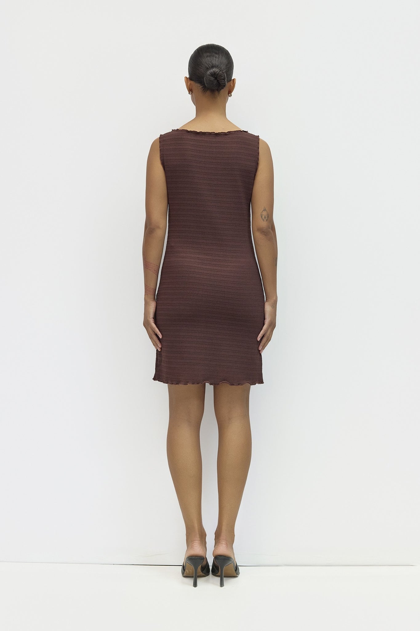 The Violetta Dress is a fitted mini dress designed with a wide neckline and a sleeveless silhouette. Lettuce-edge detailing trims the neckline, armholes, and hem for a soft, feminine finish, while full lining offers comfortable coverage. An easy mini that feels polished but still effortless.