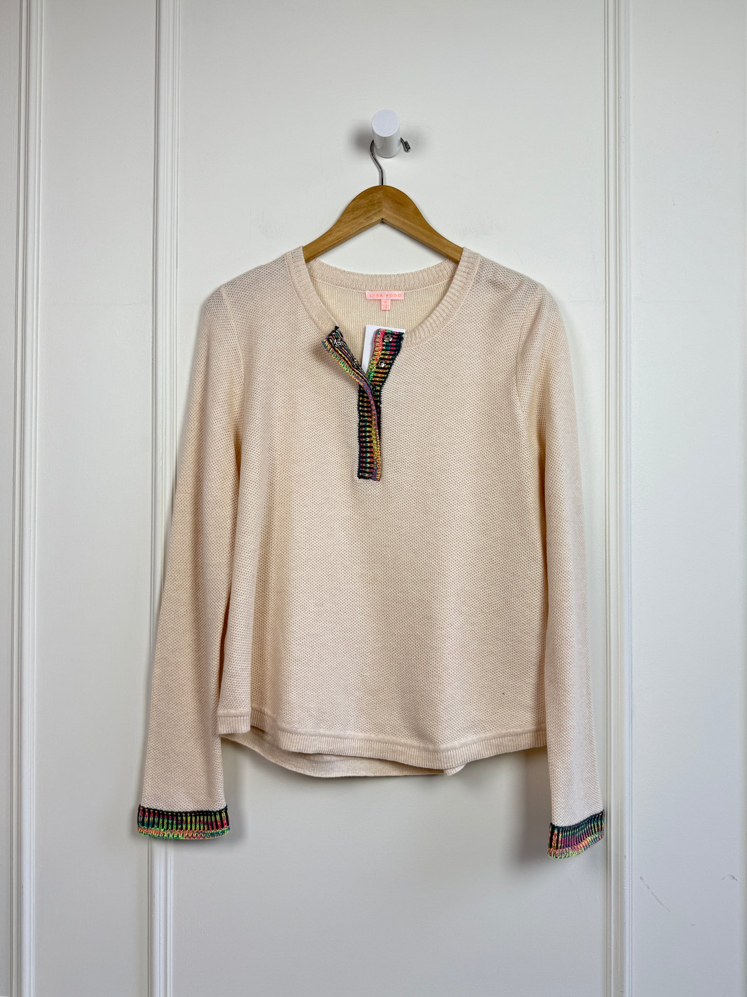 DETAILS: snap button closure ; colorful knit detail on sleeves and neckline