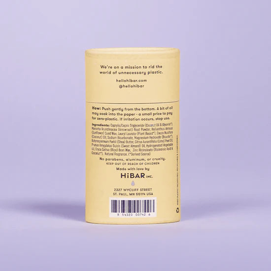 HiBAR Natural Deodorant comes in a uniquely-designed, easy-to-use, recyclable cardboard container. As a brand, their focus is to help the planet by eliminating all plastic in their products and packaging.
