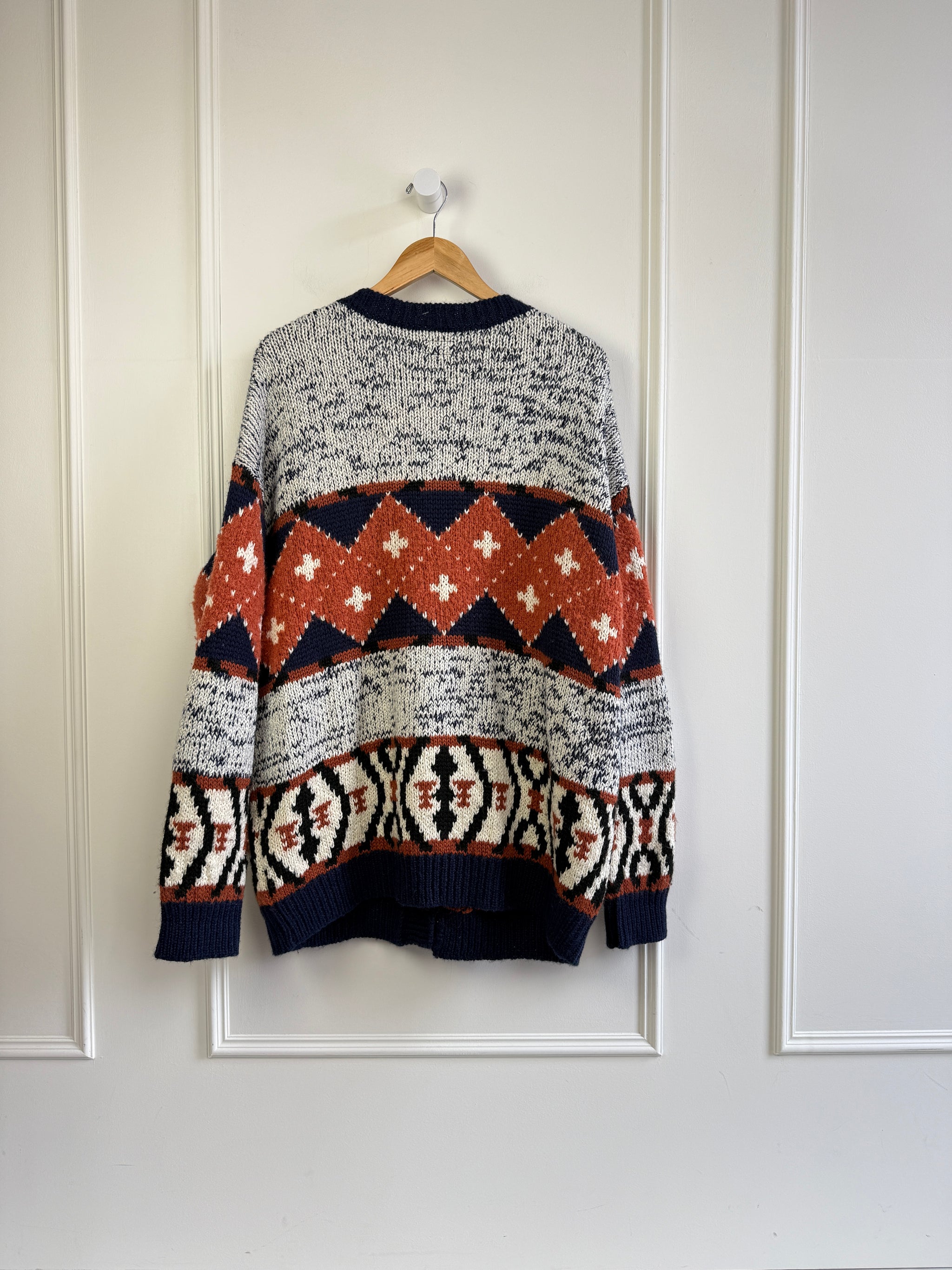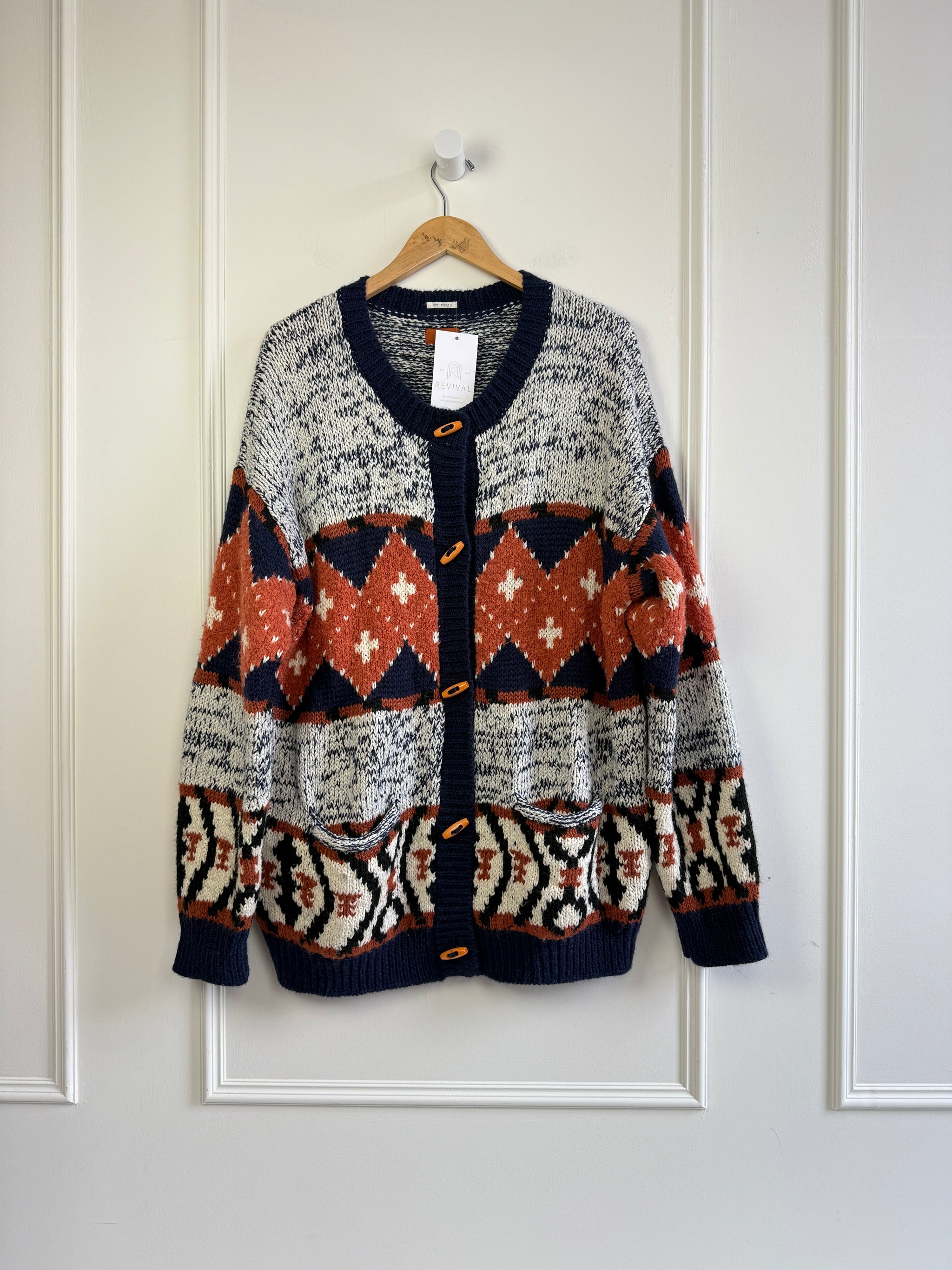DETAILS: orange & navy design, toggle closure