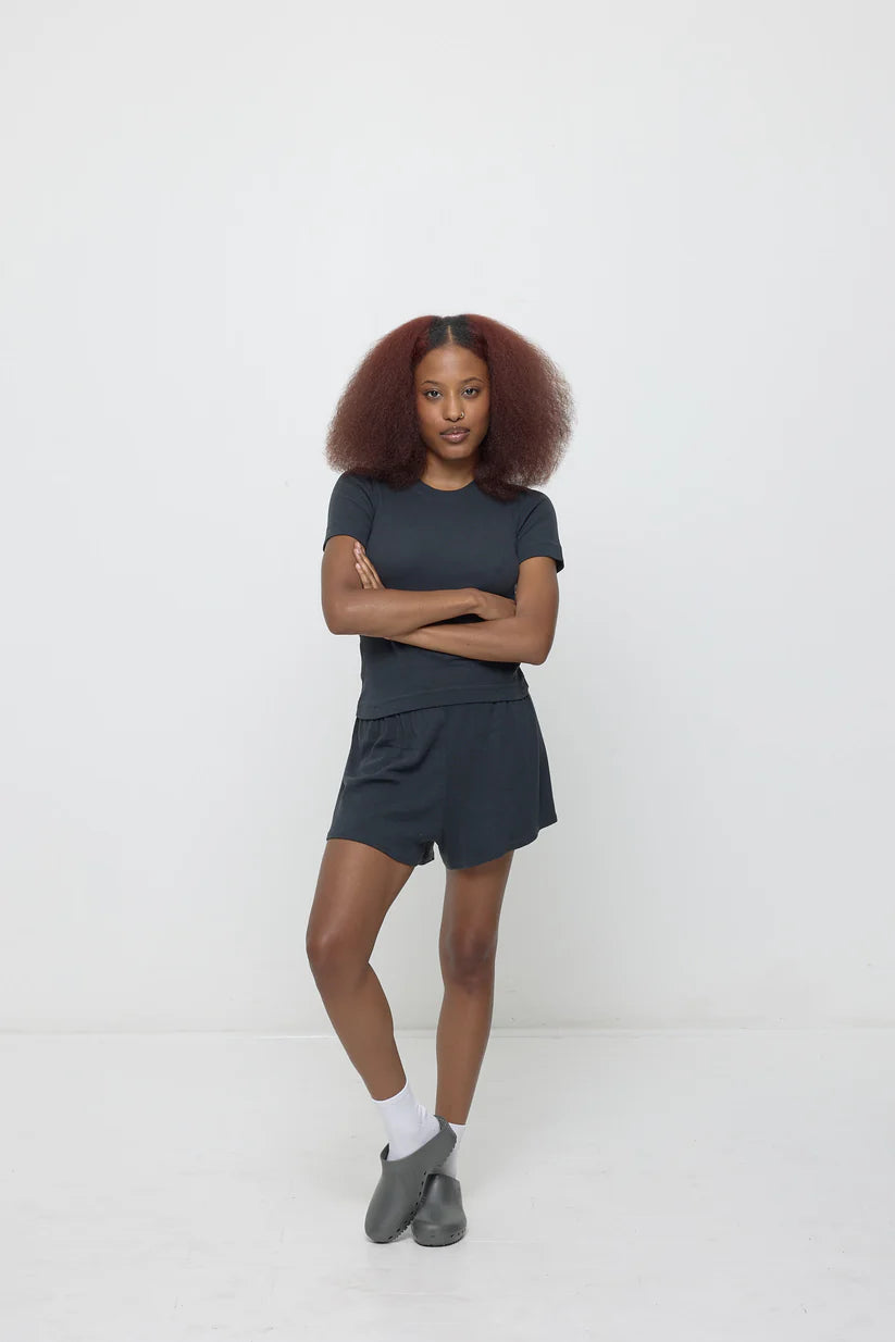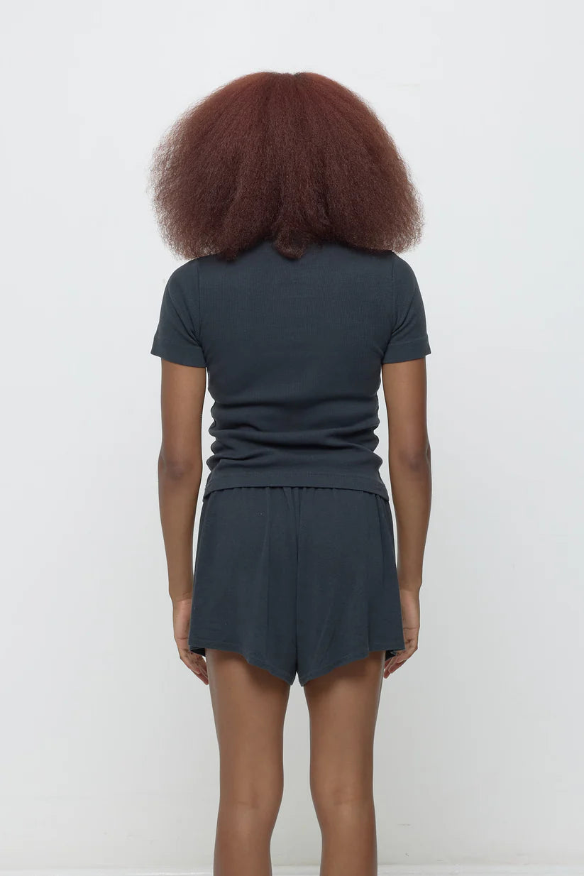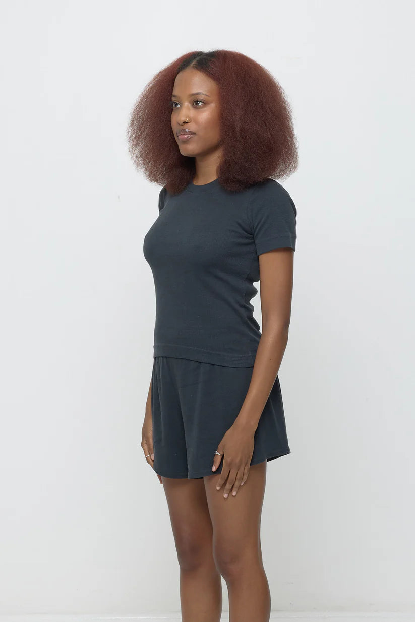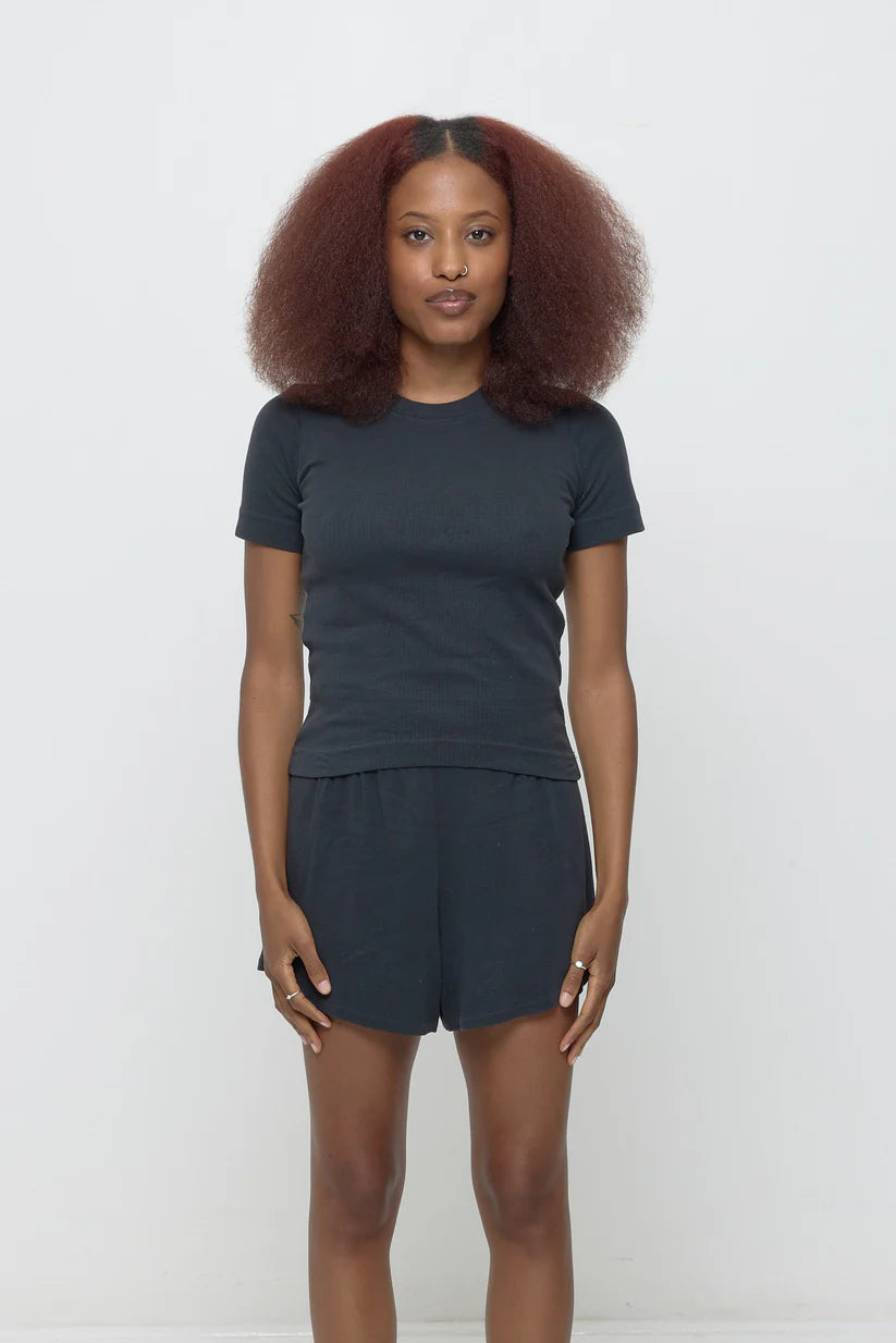 Soft ribbed short sleeve T-shirt with a heavy hem.
