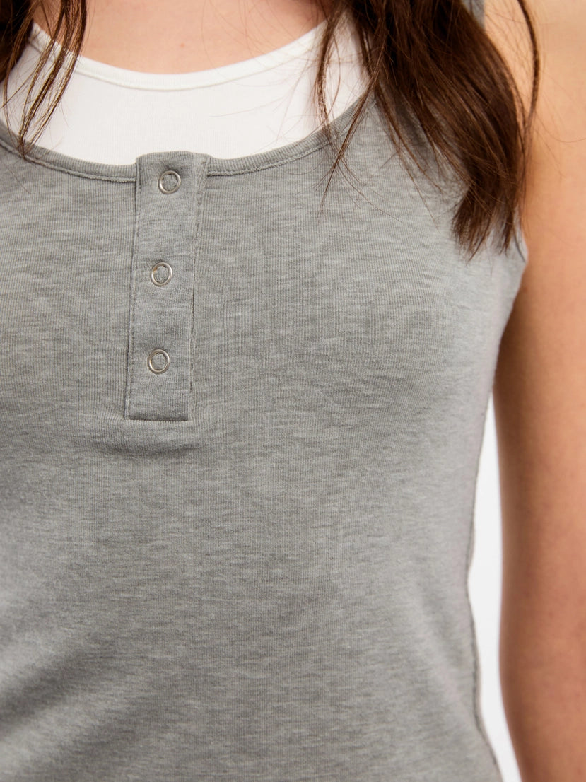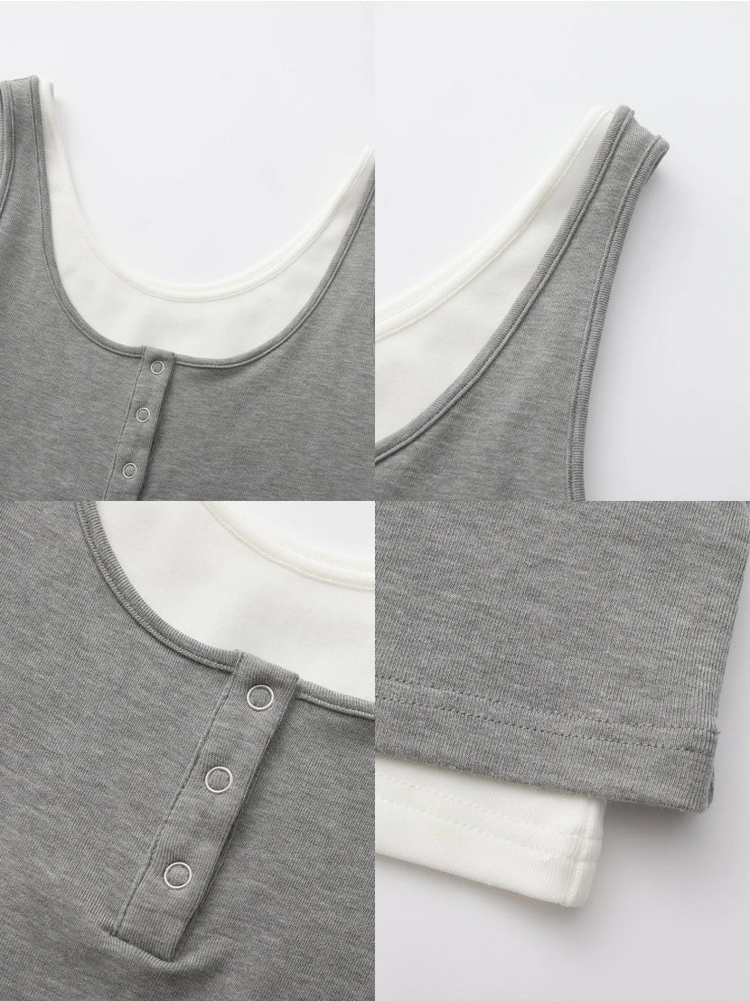 Slim short fit, comfortable and non-restrictive, accentuating your waist. Breathable cotton-spandex blend is soft and stretchy for free movement. Retro sporty style with adjustable neckline. Two-piece design: grey outer & white inner, creating stylish contrast layering. Fabric & Details: 67% Cotton, 28% Viscose, 5% Spandex Model wears size M