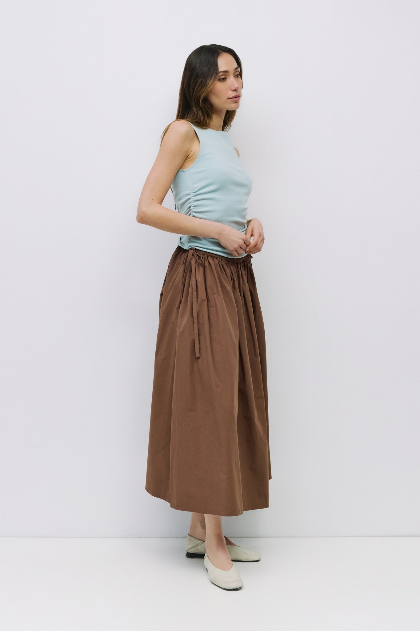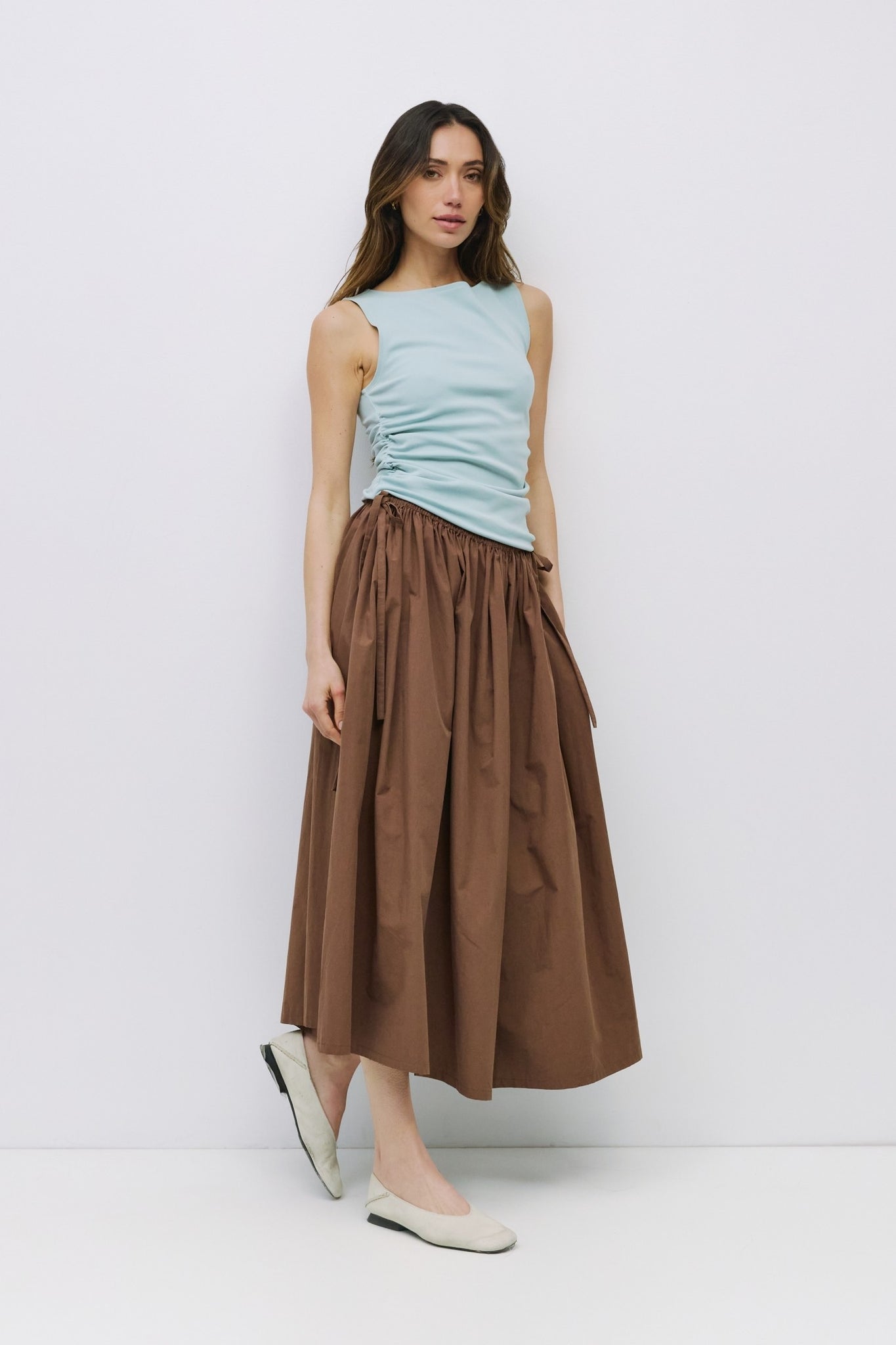 The Jordyn Top is a form-fitting sleeveless tank crafted from a soft midweight knit. Designed with a boat neckline and side ruching at the waist for a subtle, sculpted shape.