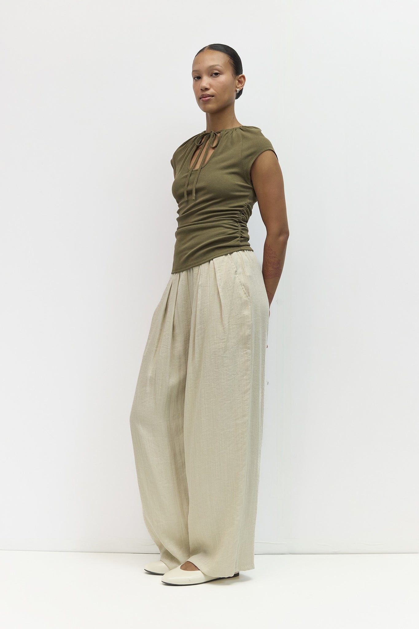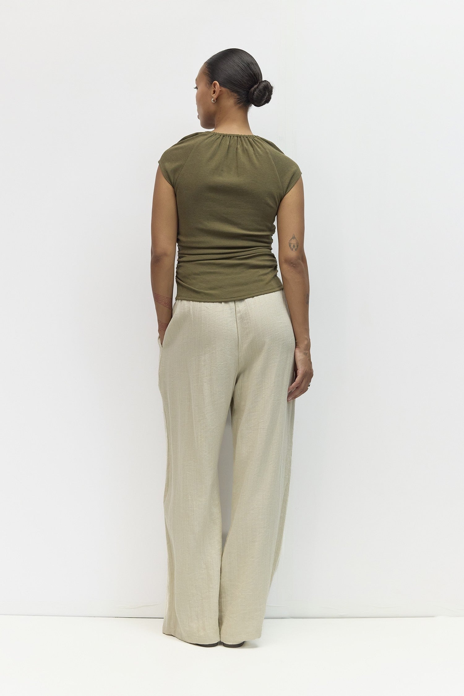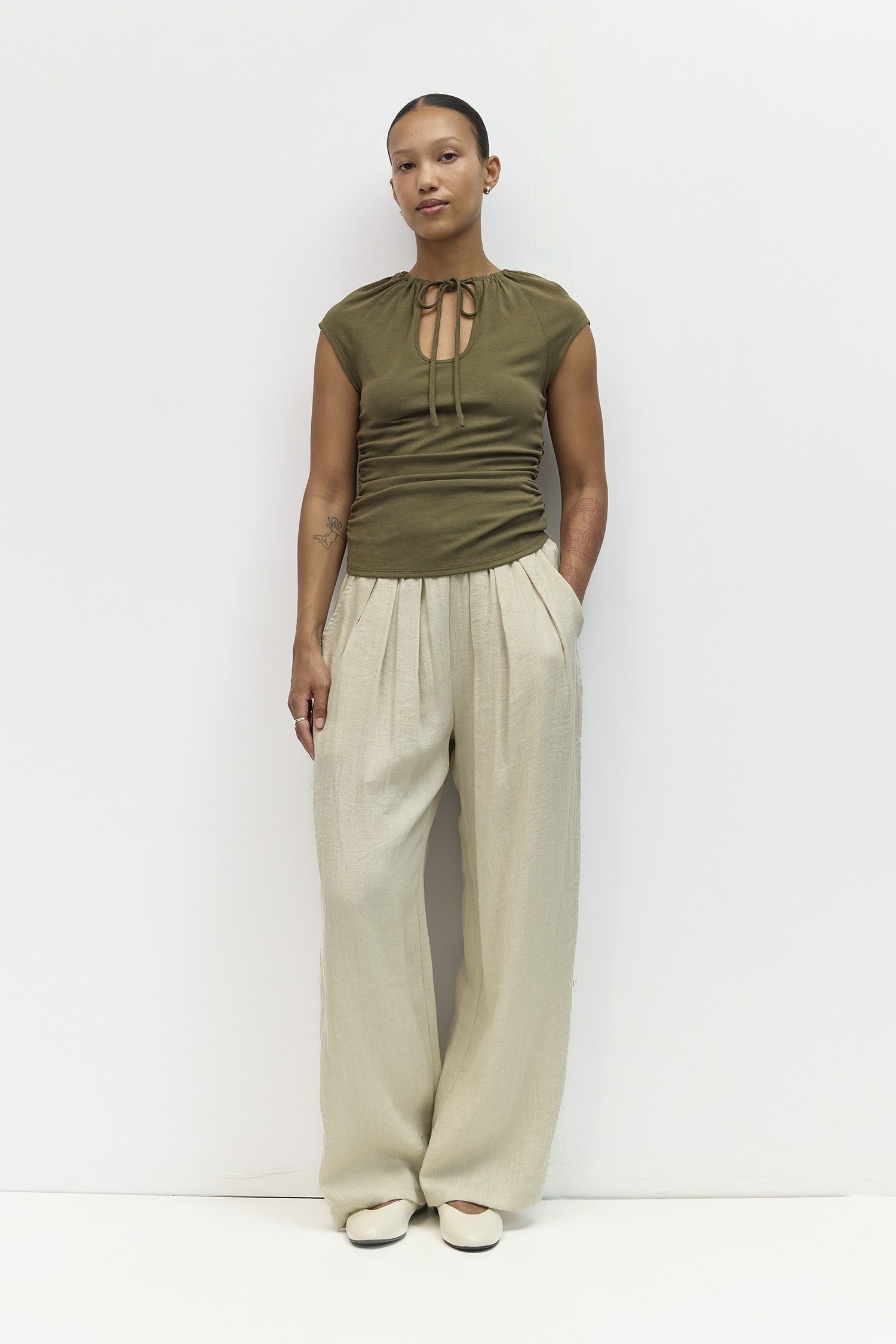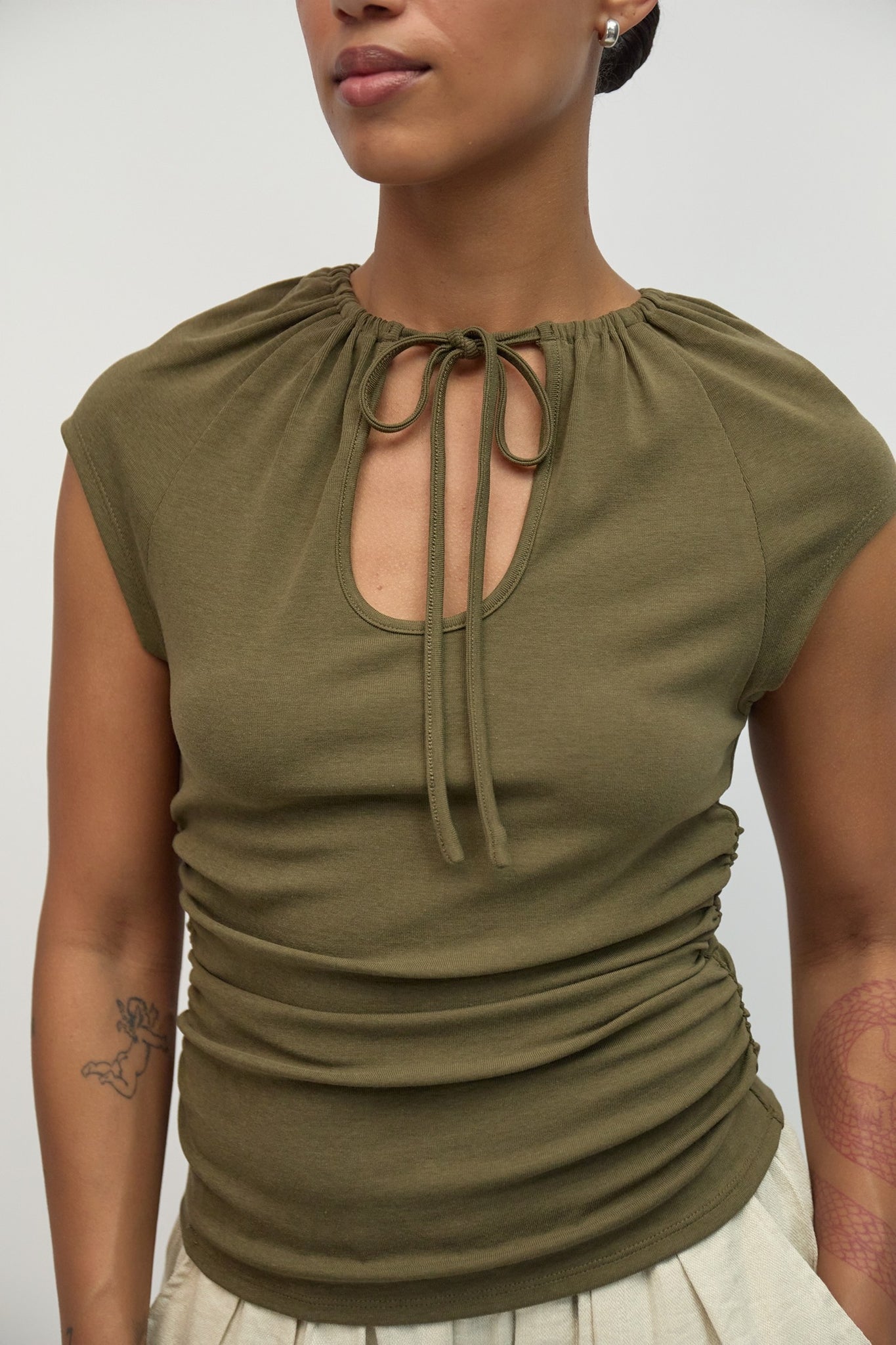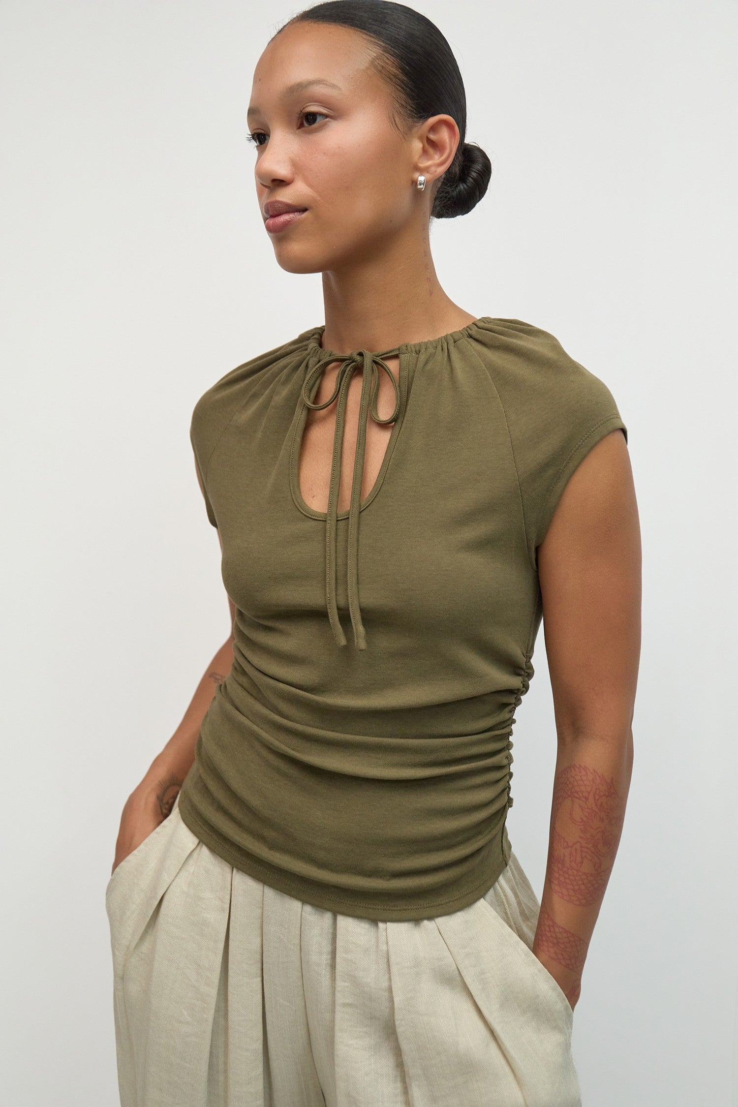 The Kelsi Top is a fitted top designed with a crew neckline and an adjustable self-tie drawstring. Featuring a front keyhole detail, raglan cap sleeves, and a ruched waist, it hugs the body in all the right places while still feeling effortless.