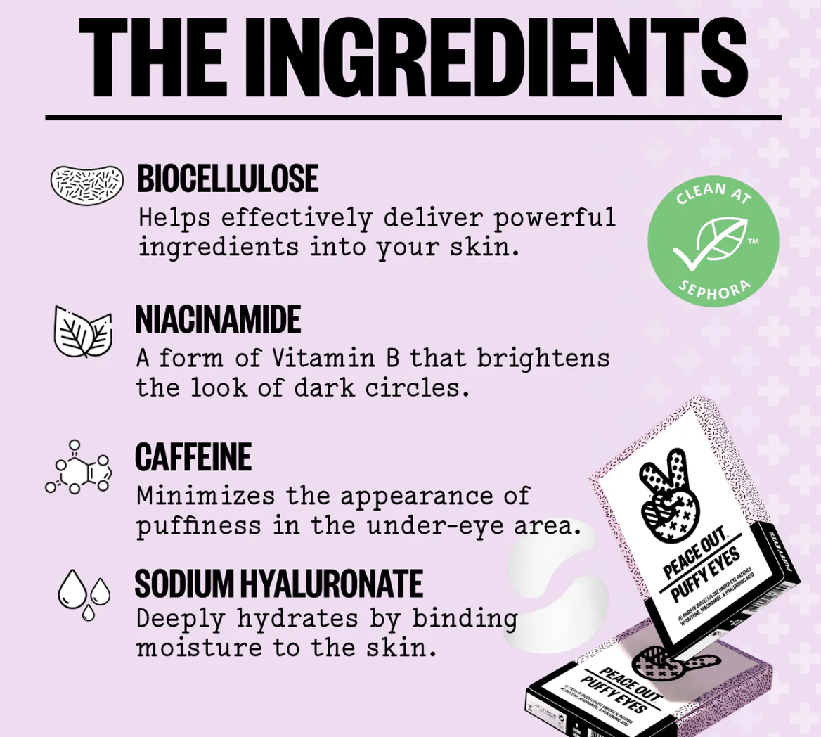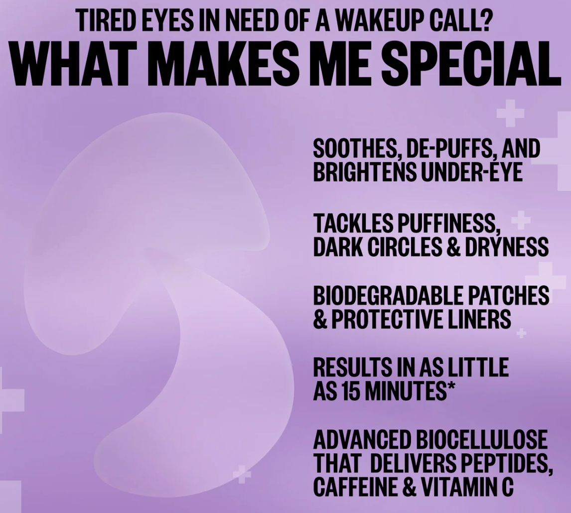 Unlike other under-eye patches that just hydrate skin's surface, these soothing bio-cellulose patches help awaken sleepy-looking eyes for a more fresh, revitalized glow and feel. These under-eye patches are soaked with caffeine to help the appearance of puffiness in the under eye area, niacinamide to minimize the look of dark circles, and hyaluronic acid to prevent skin-dehydration.