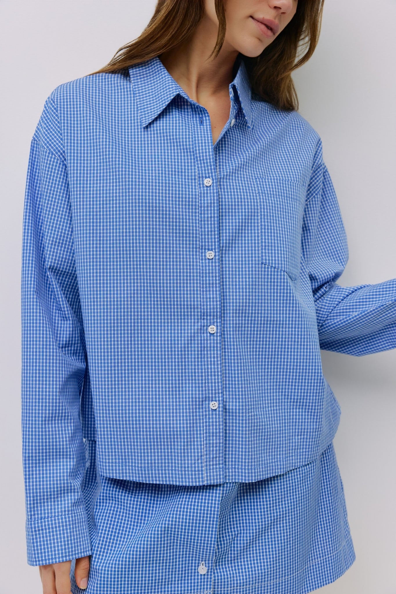 The Gates Top is a loose-fit gingham shirt with a classic collared neckline and a front breast pocket for a casual yet polished look. Finished with a back pleat, pearl button closure, and slit sleeve cuffs with button detail, it combines timeless style with modern accents.