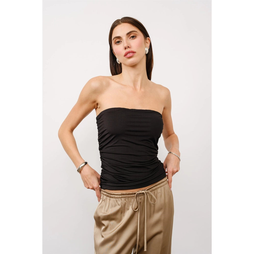 The Juliet Top is designed to flatter with side-seam ruching and a secure silicone-lined opening. Rendered in a sleek tube silhouette, she's versatile enough to style with denim, high-waisted trousers, or flowing skirts. 95% Polyester 5% Spandex