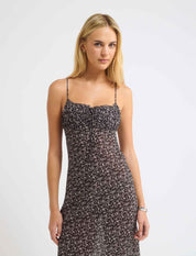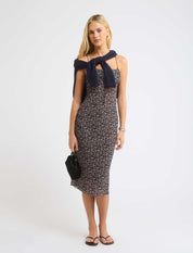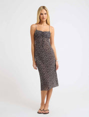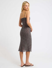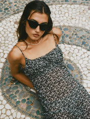 Effortlessly feminine, this dress skims the body without clinging and moves like evening air—quiet, smooth, and just a little sultry. Perfect for slipping into after a beach day, wandering through flower-filled backyards, or sipping something chilled under string lights.